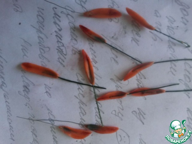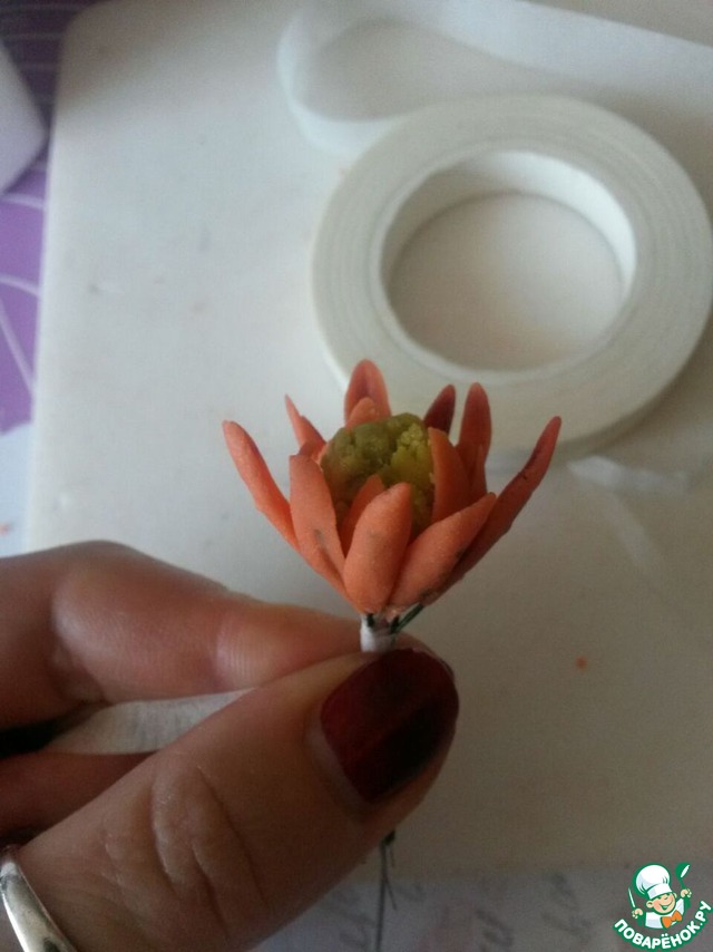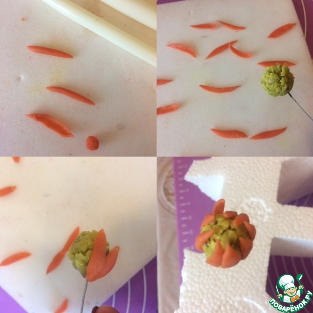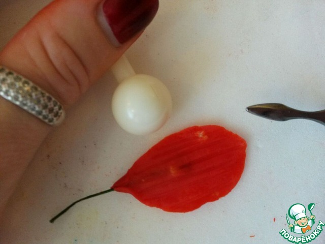 Вторую часть массы окрашиваем в нежно оранжевый или даже розовый цвет. Отщипываем от массы маленькие шарики, чуть больше спичечной головки. Пальцами осторожно делаем из каждого шарика колбаско-рулетики, утонченные по концам. Плачтиковой палочкой или обычным пинцетом продавливаем серединки, чтобы получились небольшие листочки, размером примерно с шарик. Верхние кончики листиков осторожно подпылите сухим бордовым (красным, розовым)красителем. Аккуратно приклейте к нашему шарику снизу все чешуйки. Можно клеить на воду, на сахарную воду, на разведенный СМС и кондитерский клей. Отложили или повесили на стакан.