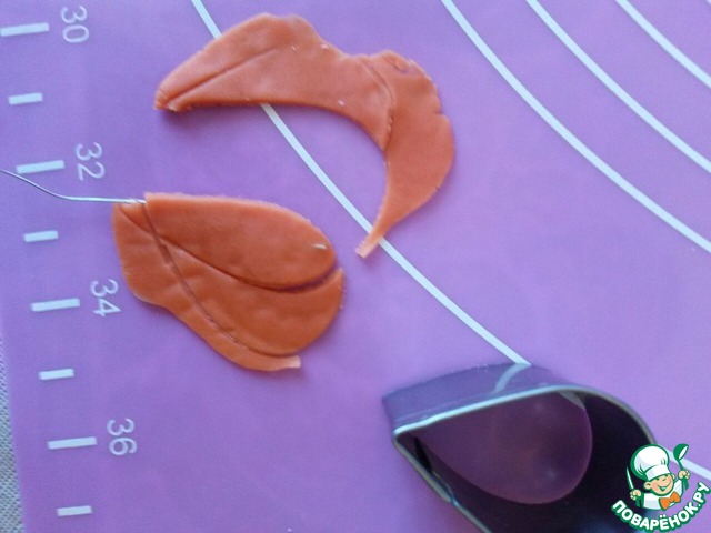 Чем больше листочек, тем сложнее его раскатывать по палочке. У опытных кондитеров для этого есть целый арсенал-досочки со специальными дырочками и специальными выемками под проволочку, но я покажу, как можно обойтись без такой доски. Это чуть дольше и сложнее, но, по крайней мере, закупаясь на первый цветок, вы не разоритесь)))
