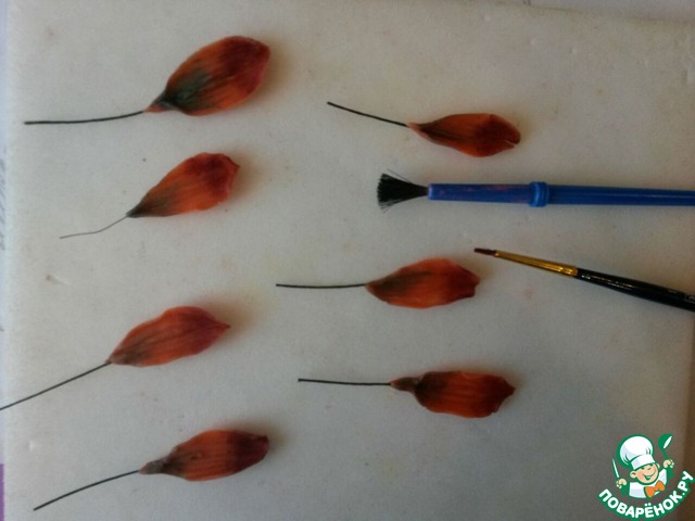 И осторожно специальной дрезденской палочкой из набора (или лопаточкой из маникюрного набора) делаем продольную полосочку, продавливая аккуратно каждый лепесточек. Внизу подпыляем каждый зеленым сухим красителем, сверху-бордовым.