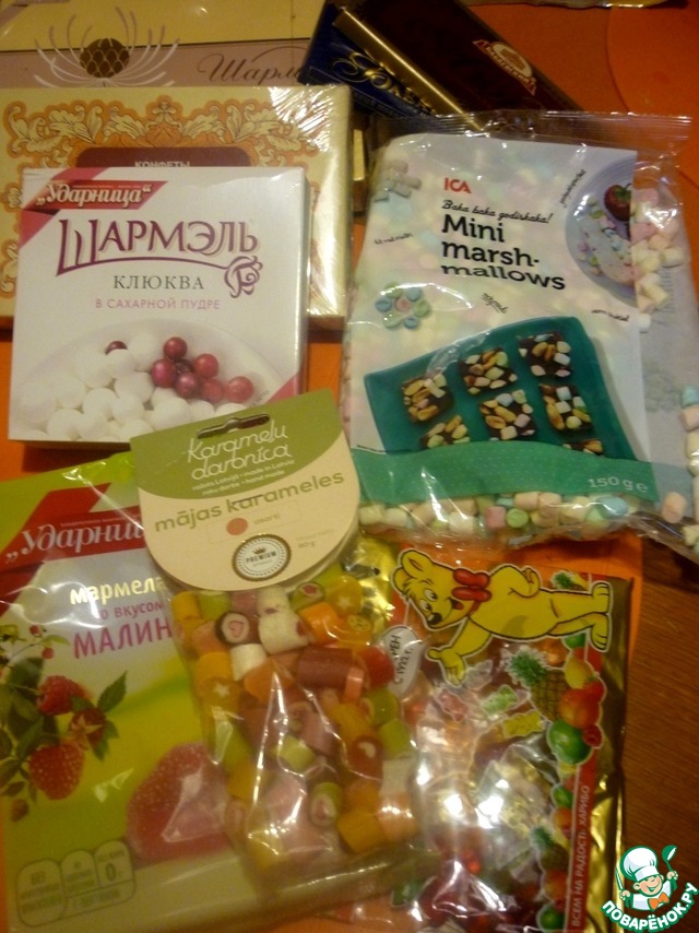 особый от меня респект за ми-ми-мишные маршмеллоу ( я такие не разу не видела в живую, мы в какаВа будем класть их), от младшего прЫнца- за мармеладки, а от стАршего прЫнца-за леденцы