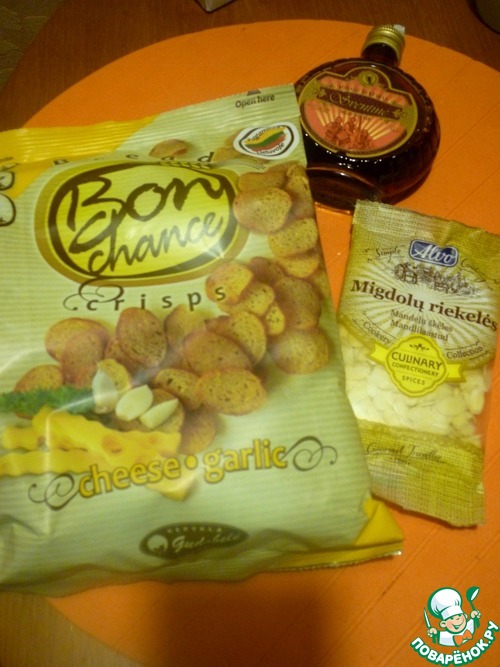 миндальные лепестки и настоечка медовая, текст на которой мы пытались перевести и определить из чего она ( даже было предположение, что из мидий... оказалась из мёда))))) Да проще было попробовать и всё, а вдруг не распробовали бы)))