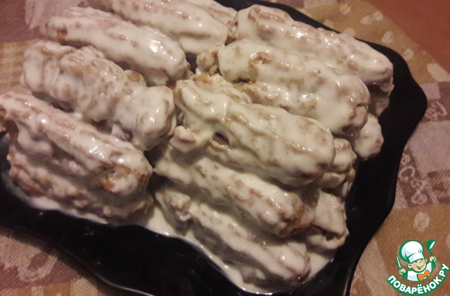 Он успел постоять пару часиков в холодильнике, ожидая своего часа, потому не успел качественно пропитаться. На утро вкус был еще более нежный. Я впервые использовала для сладкого что-то кроме пшеничной муки, но результат порадовал. Ожидала, что заврные поднимутся, но они остались такими же и никак, из того колличества теста 35-40 штук у меня выходить не хотело. Резаться так же отказался категорически, мы не долго думали, съели по "запчастям" )))