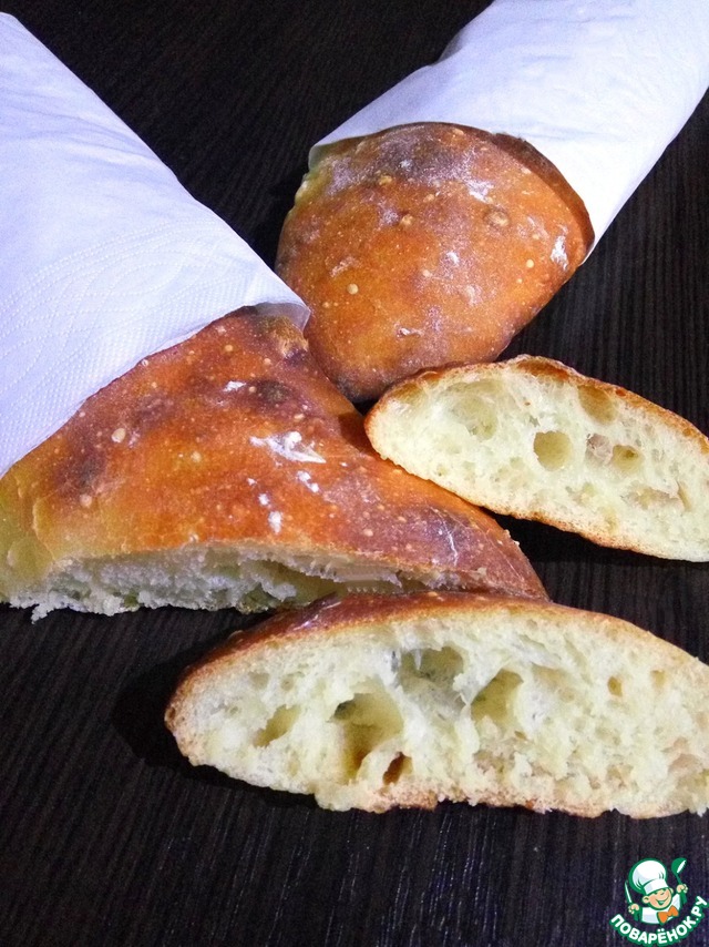 Ноздреватый, пружинистый, очень интересный хлеб! Чем-то похож на чиабатту. Корочка хрустящая, тонкая. Из отступлений: использовала 3 гр. свежих дрожжей. Когда формовала багеты, думала что все, пеку блины. Ан нет! За час отдыха перед выпечкой покрылись огромными пузырями! При наличии времени буду печь! Таня, спасибо за интересный рецепт!!!