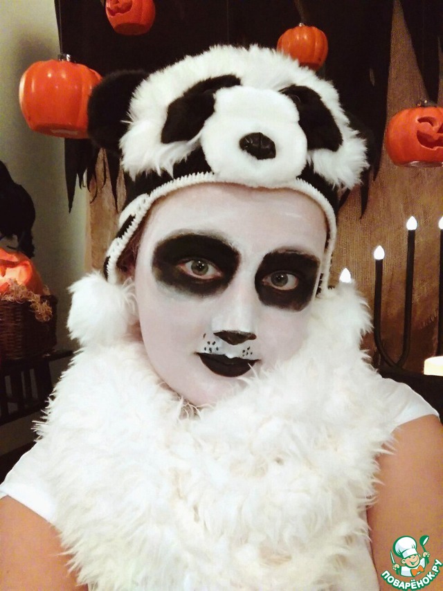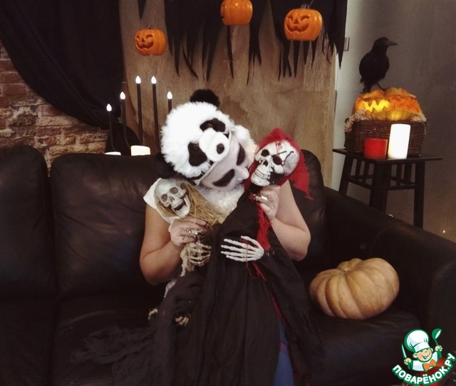 Панда валялась на диване, загрызла двух скелетов, поедала груши, виноград и огромный праздничный тортик размером с половину стола.