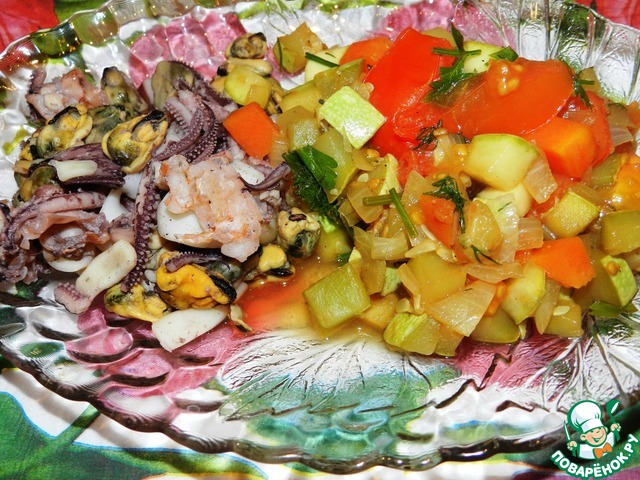 Ничего особенного, просто морской коктейль и овощное рагу. Получилось вкусно и красиво