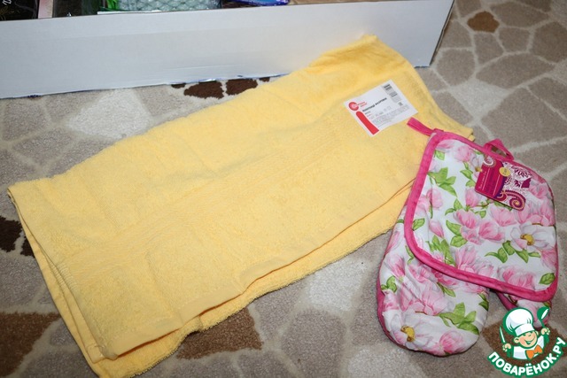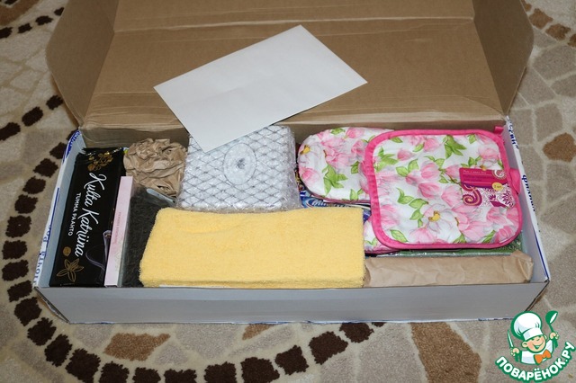 Начнём потихоньку разбирать клад! Сразу обнаружила большое письмо!!! Столько теплоты и заботы!!! Классно, читаешь и как будто с человеком разговариваешь!!! Перейдём к подарочкам - Мягкое жёлтое полотенце и такая нежная прихватка с цветочками.
