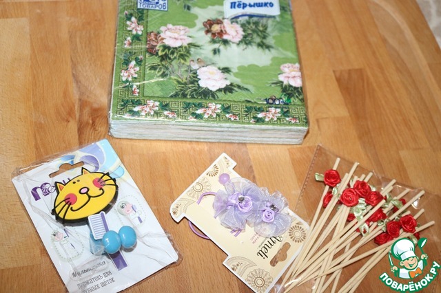 Очень интересные шпажки ручной работы - (припрятала до ближайшего праздника!)Классный котик-присоска для зубной щётки, дочечка очень оценила, сразу приклеили - висит на самом почётном месте в ванной!!! Резиночки всё той же принцессе! И пачечка салфеток - тут вообще интересно, муж говорит - а как Оля догадалась, что у нас кухня зелёненькая!!! Вот вот, догадалась же!!!