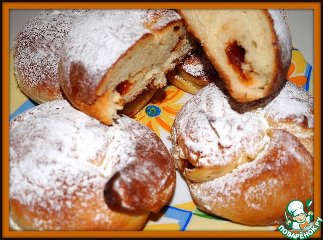 Испанские булочки с заварным кремом от Ксюши Тортишка. Хорошие, вкусные булочки. Тесто очень приятное в работе. Слишком поздно обнаружила, что дома нет молока, поэтому вместо крема яблочное повидло.