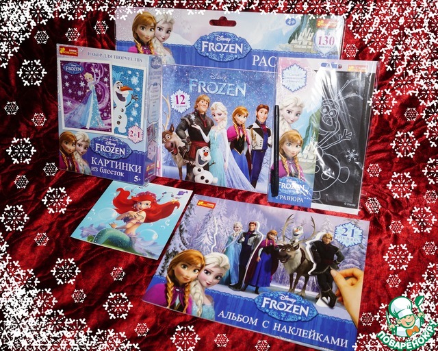 В нем была мечта поклонницы Эльзы (из мультика "Холодное Сердце" ) - раскраска, наклейки, книжка с наклейками, набор для создания открыток и набор для создания открытки гравюры с Олафом. Уже все попробовала - сказала - это все просто классно!!!