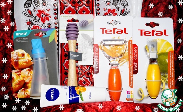 А это какая-то мистика - как раз собиралась пойти на этой неделе и прикупить именно эти вещички, все их хорошо знают - кисть с емкостью, ложка для меда, не знаю как эти штучки правильно называются - одна для шинковки морковки, вторая для цедры. И о моих ручках Никуля тоже позаботилась - прислала такой чудесный крем