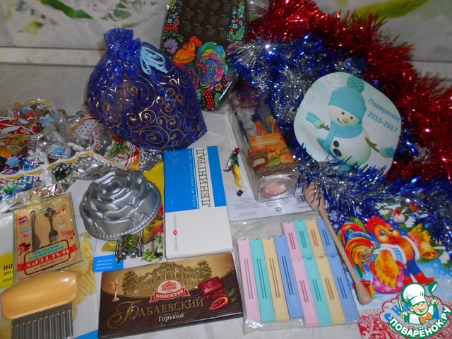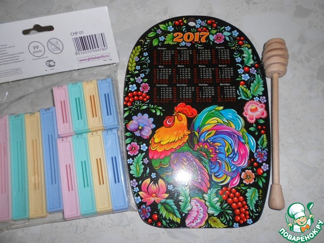 А теперь по отдельности. Расписная деревянная доска с красивы новогодним символом-петушком и календарем на Новый 2017 год, она у меня займет почетное место на кухне. Набор клипсов для пакетов (очень нужная вещь на кухне).