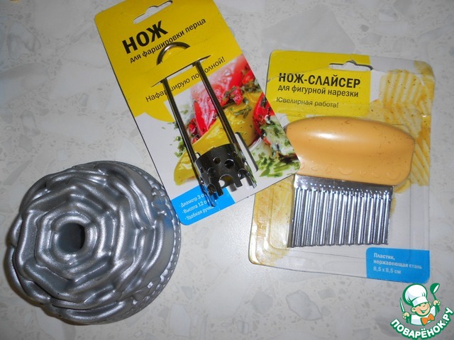 Приятные и полезные кухонные аксессуары: нож для фаршировки перца ( о существовании которого я и не подозревала), нож-слайсер для фигурной нарезки, формочка в виде розы для кекса.