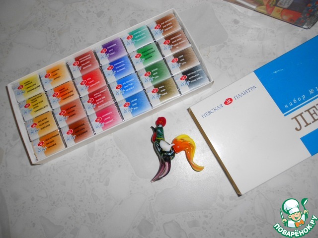Снегурочка не забыла и про дочку. Ей достался очень большой подарок-Ленинградские акварельные краски, чему она оказалась очень рада. Она просто в восторге от своего новогоднего подарка и шлет нашей Снегурке большую благодарность. И милая фигурка символа года -петуха, стеклянный маленький яркий петушок, ну просто чудесный...