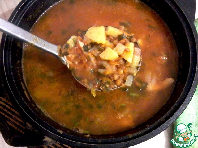 Чудесный зимний согревающий суп. Настолько самодостаточный, что не хочется вносить никаких изменений в рецепт. Единственное - у меня чечевица зеленая (сорт "тарелочная" ) и она взяла меньше воды, суп получился не таким густым, как у автора на фото. Но это нисколько не умаляет вкусовых свойств блюда, так как бульон очень наваристый и насыщенный! Мы ели и с уксусом, и без - вкусно!