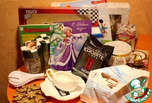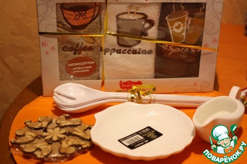 Полотенчики, подставочка с символом года из можжевельника (ох и аромат у меня теперь будет), соусник, тарелочка в виде ракушки