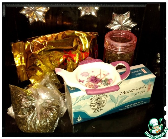 Целый комплект чаев, в том числе один з моих любимых:молочный улун. И цвета моей мечты подставочка под чай.