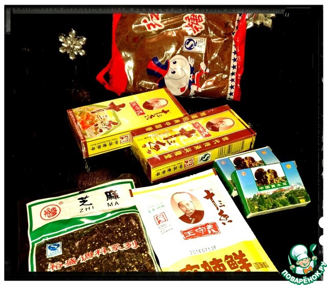 В пакете с кем-то в цилиндре - коричневый сахар. Я так понимаю -это вот дарк мусковадо, только китайского производства. Для выпечки просто изумительная штука -мне нравится. Грибы замачиваются в теплой воде и очень увеличиваются в объеме, это древесные устрицы черные. Они хорошо идут в китайский салат. К сожалению, я не успела выставит рецепт классического китайского салата на конкурс Путешествия +К - в больнице отдыхала.