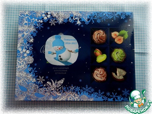 И ещё сладости. Очень красивая коробочка конфет, с интересными начинками и эмблемкой акции