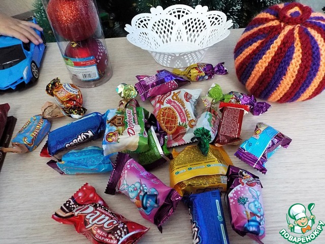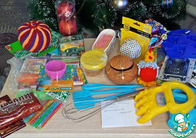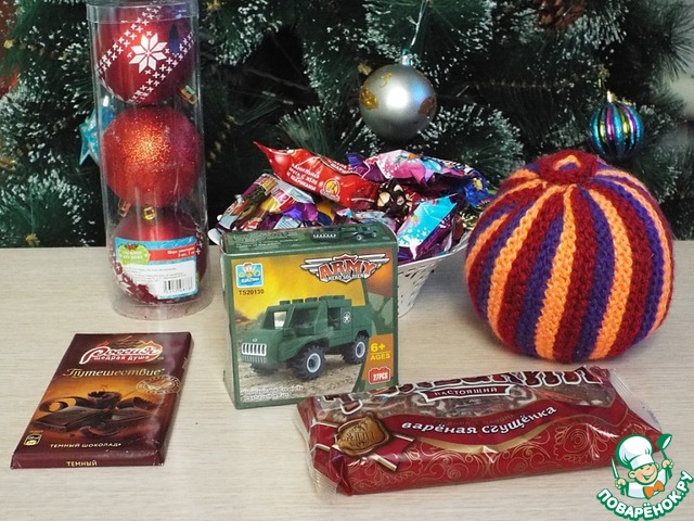 Сладости, елочные игрушки, вазочка для конфет. И Обалденный мягкий мячик с трещеткой внутри. Дети заценили.