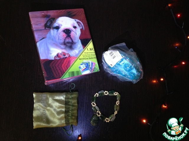 А это альбом для фотографий с милой собачкой, массажёр и очень красивый браслетик, упакованный в милый мешочек.