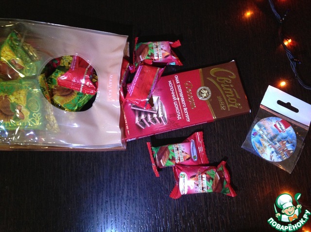 Это мешочек с вкуснейшими конфетками, шоколадкой и красивым магнитиком
