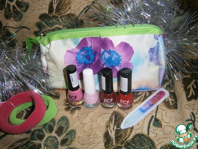 Это для дочки. Наташенька упаковала их в красивую косметичку - лаки для ногтей (хотя ногти она еще не красит, тут же решила, что на Новый год это нужно сделать и я должна ее этому научить), пилочка для ногтей и я ркие резиночки для волос.