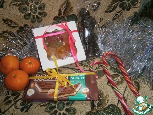 Не обошлось и без сладостей. Целый пакет самых новогодних фруктов - мандаринок (в кадр попали только три), наши любимые шоколадки и леденцы и коробка с вкуснейшим мармеладом (домашнего производства?).