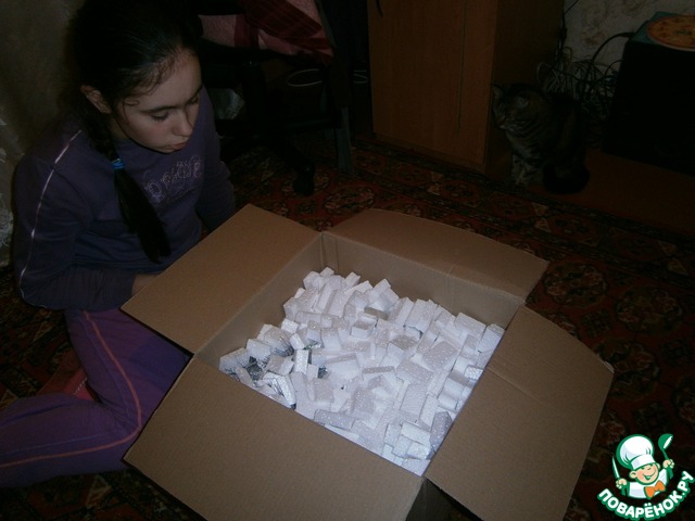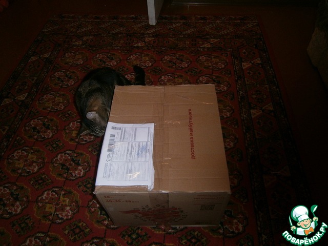 Я мужественно выстояла очередину, и вот у меня (вернее у мужа) в руках заветная посылка. Открывали мы ее ближе к ночи, так как сразу домой не попала. Домашним велела посылку без меня не открывать. Ладно, не буду вас томить. Начнем разглядывать подарки. Первым конечно же был кот.