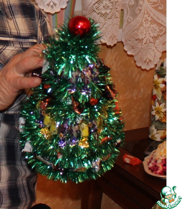 Елка из шоколадных конфет и мишуры - мастерила на подарок.
