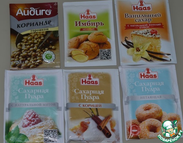 Сахарная пудра со всевозможными добавками, имбирь, кориандр