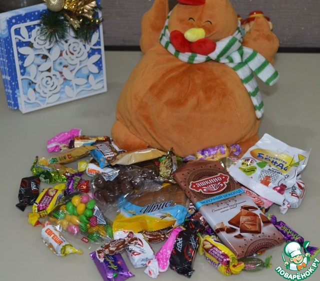 Дальше шла очередь плюшевого петушка, да не простого, а с секретом - внизу петушок закрывается на молнию, а когда мы раскрыли молнию, оттуда как из рога изобилия посыпались конфеты.