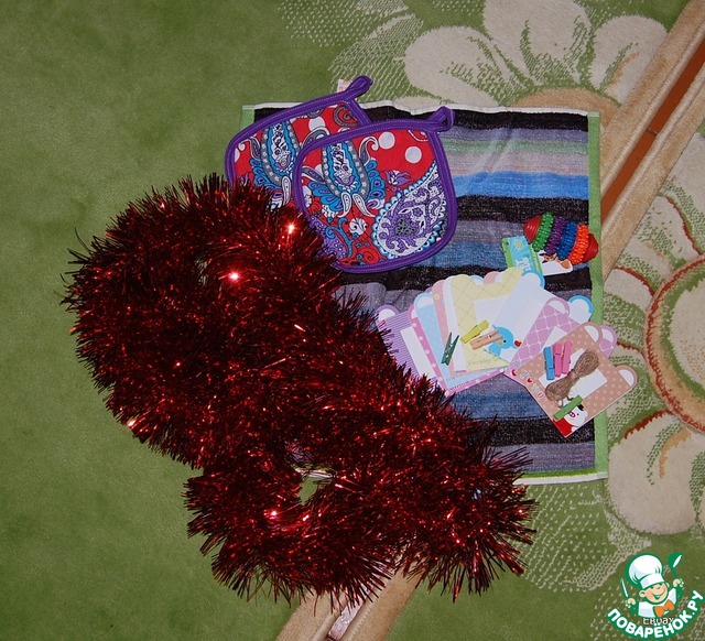 Елочная гирлянда (на ёлочке нашей уже давно!), прихватки (очень нужная вещь, т. к. у меня их не было и пользовалась полотенцем, теперь будет удобнее), полотенце, интересные открыточки с прищепками (можно вешать куда-нибудь, вписав пожелание), игрушка для наших четвероногих!