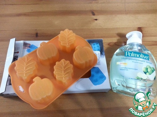 Лежали яблочки в замечательной металлической коробочке, она мне тоже очень пригодится. И еще чеснокоизмельчитель.Насколько Ириша внимательная подружка, я убедилась в очередной раз. Как то, разговаривая по телефону, Ириша обмолвилась о мыле для кухни, которое убирает запахи с рук после готовки. Я сказала, что у нас не видела такого. Ирочка прислала мне такое мыло с ароматом лайма. А еще, когда я приготовила и отчиталась по рецепту мармелада, то писала, что заливала в формочки из пластика и оттуда тяжело вынимать мармелад. Так вот это чудесные формочки из качественного силикона, которые Ириша с мамой мне прислали.