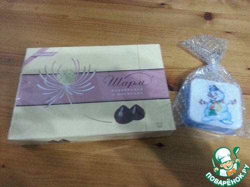 Не остался без подарков и мой муж. И тут Ириша проявила внимательность. Когда я готовила мармелад, то написала, что мой муж очень любит мармелад, но не в сахаре. И вот ему в подарок Ириша прислала мармелад в шоколаде и замечательное мыло ручной работы с чудесным снеговичком.