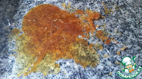 5. Остывшую "карамельную стекляшку", поднимаю со стола, отделяю от плёнки.