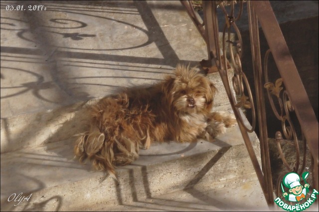 Зверь невиданный прочно поселился у нас после того, как был застукан в дождь спящим на половичке около нашей двери. Испугавшись, умчался вдаль, но остановился и стал приветственно вертеть нам хвостом. После этого, рядом с дверью ему была выставлена миска с едой и постелен старый пододеяльник. Зверь получил временную кличку Кузя по своему сходству с домовёнком, хотя больше похож на Шурика. Пол по-прежнему не определён из-за обилия дредов в нижней части туловища. Когда писает - поднимает ногу, но, исходя из прошлого опыта, это ещё ни о чём не говорит. На сегодняшний момент не убегает, когда выносим еду, даёт почесать себе голову, вовсю вертит хвостом, живёт в основном на пододеяльнике или на дверном половичке, изредка удаляется к друзьям, баб не приводит. У него светлые глаза, розовый поросячий нос и неправильный прикус с кривыми зубами, но он всё равно милейший, на мой взгляд.