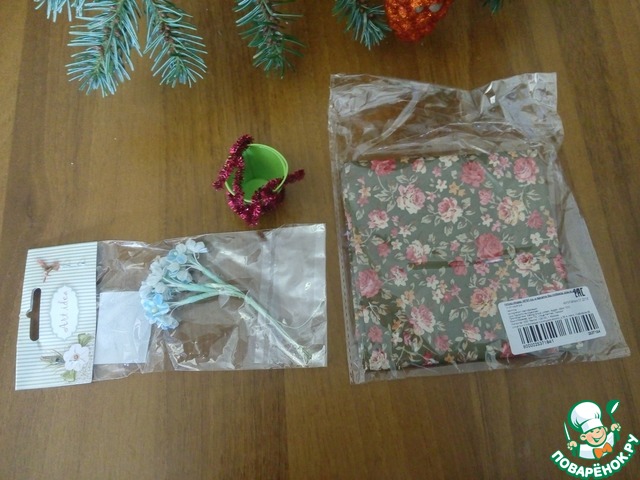 Всякие красоты для фудфото: кусок ткани, маленькое ведерко (такое хорошенькое и даже обмотанное мишурой) и букетик цветов.