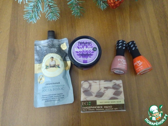 Все для красоты: бальзам для волос, крем для тела, мыло ручной работы и два ярких лака для ногтей.