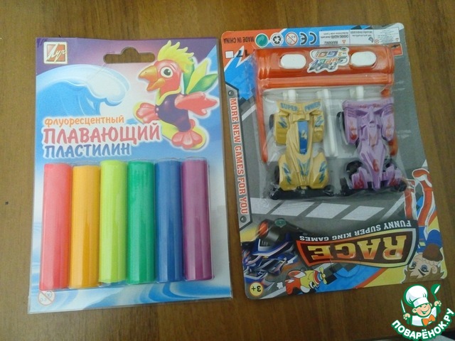 Для сына плавающий, еще и флуоресцентный пластилин, ну и конечно же набор гоночных машинок.