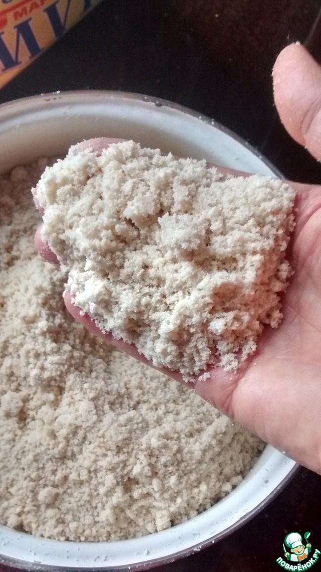Все сухие ингредиенты смешать и соединить с холодным наструганном маслом. перетереть хорошо в мелкую крошку. Можно это делать в комбайне. Крошка похожа на морской сыпучий песок.