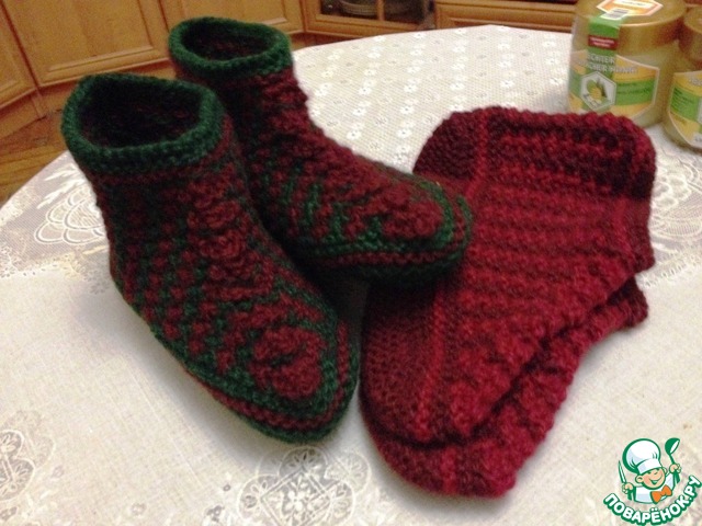 А ещё... тапочки, связанные собственноручно для меня и моего оболтуса! Оленька, мелкий мой в них только не спит!!!