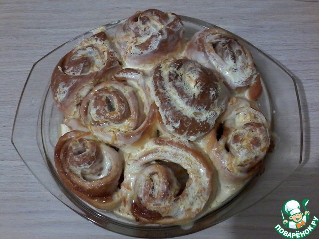 Чудесная идея со сметанной заливкой, очень напоминает булочки "синнабон", только бюджетнее, а вот вкус мне кажется даже выигрывает. Я делала с яблочным повидлом, а в сметану добавила цедру апельсина. Сметана мне кажется играет здесь ключевую роль- за счет нее изделия становятся очень мягкими, нежными, сливочными, семья вообще сказала, что это не просто булочки, а настоящие пирожные)) Булочки я повторяю вот прямо сейчас, жду пока подойдет тесто, пока пишу отчет. Из указанного количества ингридиентов у меня получилось два таких блюда) Спасибо автору большое)