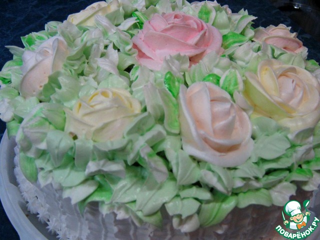 Бисквит пеку, нежный, воздушный, как пушинка.))) Пропитка -сироп с коньяком. Крем для прослойки - Пломбир. Оформление - Мокрое безе.