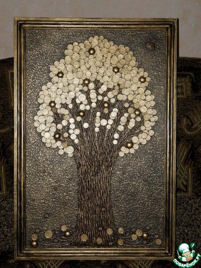 Крона дерева из настоящих монет, а плоды - из магических камней "Марблс". Картина покрыта акриловыми красками - шоколад и золото, и яхтным лаком. Ствол дерева изготовлен из скрученных салфеток.