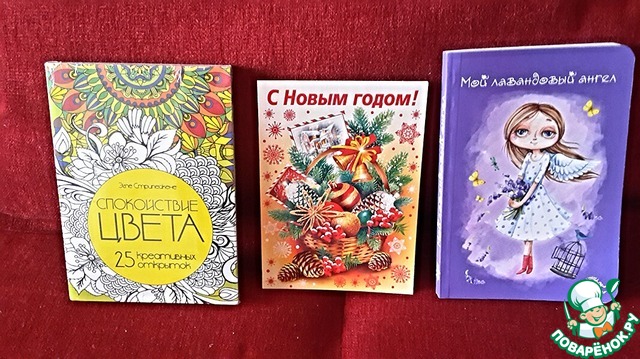 Еще в посылке была милейшая открытка с теплыми новогодними пожеланиями, блокнот для записей и медитативные открытки-раскраски для моей барышни, которые она тут же с восторгом уволокла: