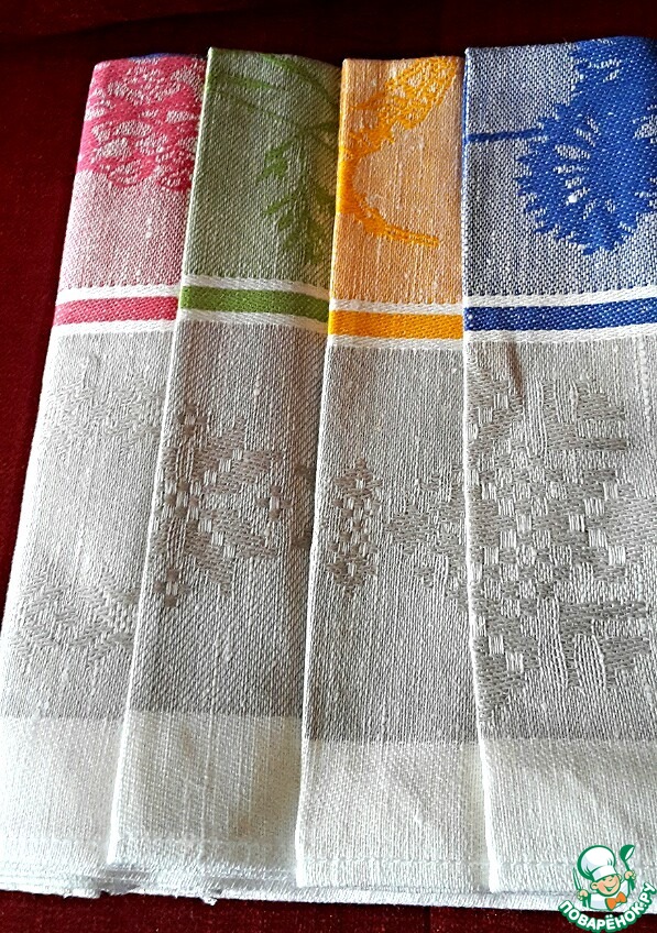А вот это вообще красотища: четыре полульняных белорусских полотенца! Каждое своего цвета, и каждое со своим рисунком! Красное с люпинами, зеленое с былинками, желтое с одуванчиками, а синее с васильками. Мечта!
