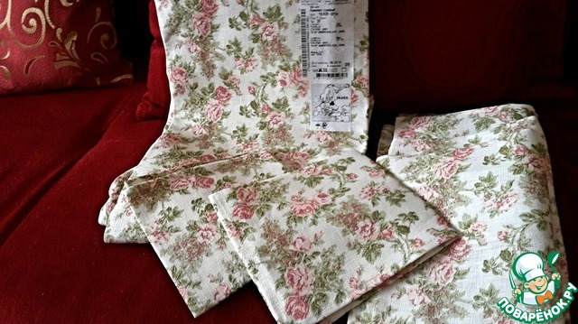 Тут я ее распотрошила, и поняла, что во всем есть тайный смысл. Таких подарков можно было ждать и до 8го марта! Посмотрите, какая в ней была дивная льняная скатерть белорусского производства! И еще 6 десертных салфеточек!