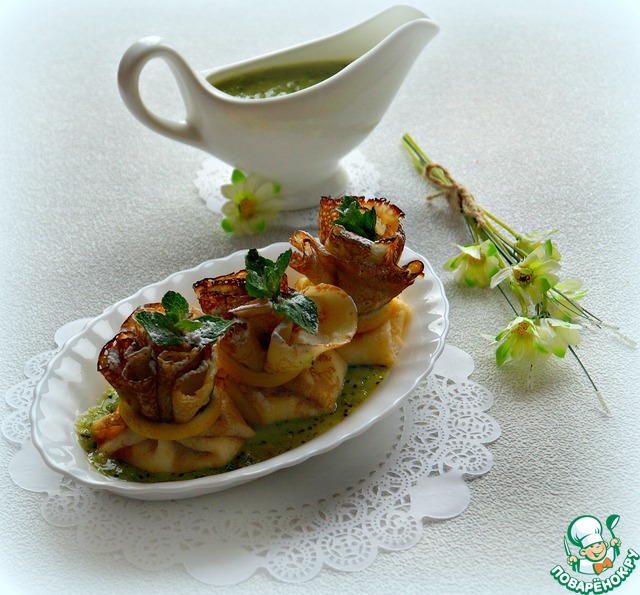 Блинчики по этому рецепту получились тоненькие-тоненькие, но крепкие, для мешочков - самое оно. Вместо мороженого в творог добавила взбитые сливки. Начинка получилась вкусная, воздушная. Но самая бомба в этом рецепте - это соус из киви. Очень вкусный и прекрасно дополняет все блюдо. Оксана, спасибо за рецептик.