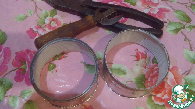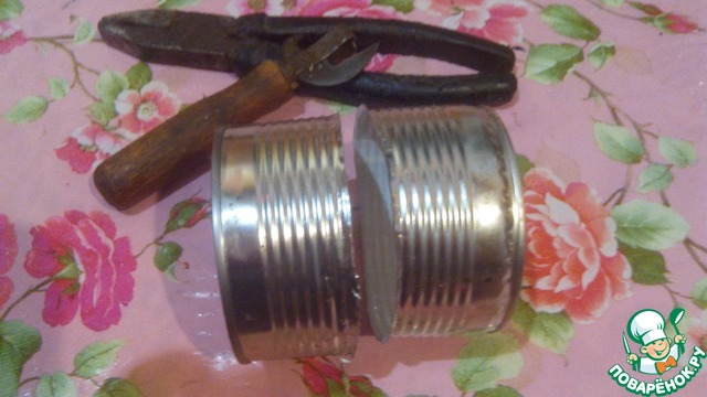 Консервным ножом банку разрезала на две половины, на банке были небольщие ребрышки, это только помогло держатся правильного курса, т. к. банка была с самооткрывающейся крышкой, то дно удалять тем же консервным ножом пришлось один раз. Пассатижами обмяла неровные края и вуаля! две формочки были готовы!