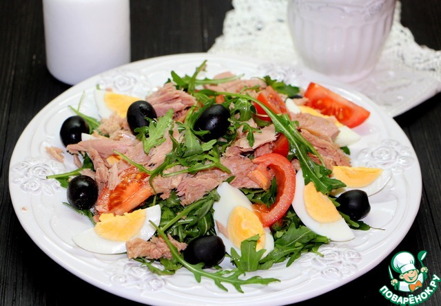 Обалденный салат, учитывая, что я рукколу не люблю... А тут аж за ушами трещало. Лука не было вообще, перепелиные яйца заменила на куриные, черри на бакинские томаты (но мелкие), а оливки, которые хоть и были, я люблю меньше маслин, поэтому маслины. Но вкусно - очуметь можно!